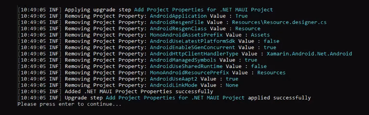 Figure 5 : .NET MAUI 용 .NET Upgrade Assistant 의 정보 output