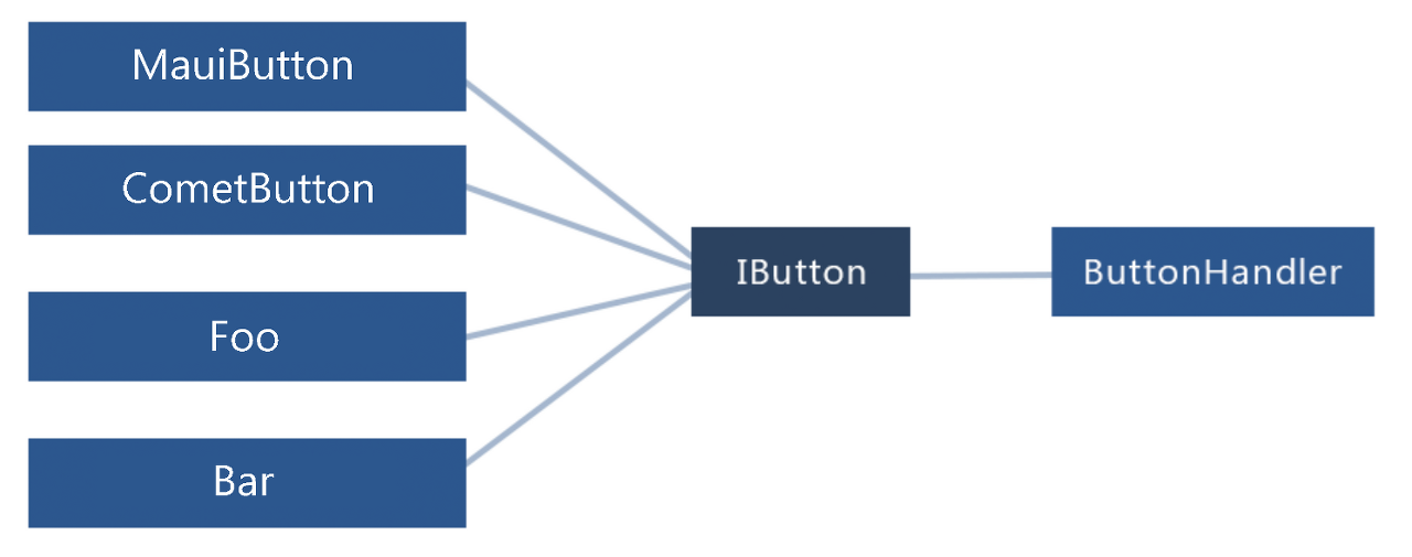 기본 Infrastructure 재구성의 첫 단계는 control 간의 강한 연결을 제거하는 것입니다. .NET MAUI 팀은 control 들을 interface 뒤에 두고 각 component 는 interface 를 통해 상호작용하도록 구현하였습니다. 이런 방식은 IButton 과 같은 무언가를 다르게 구현하는 것을 쉽게합니다. 동시에 기본 Infrastructure 가 모든 구현사항들이 동일한 방식으로 처리하는지 확인합니다. Figure 2 는 이를 개념적 관점으로 보여줍니다.