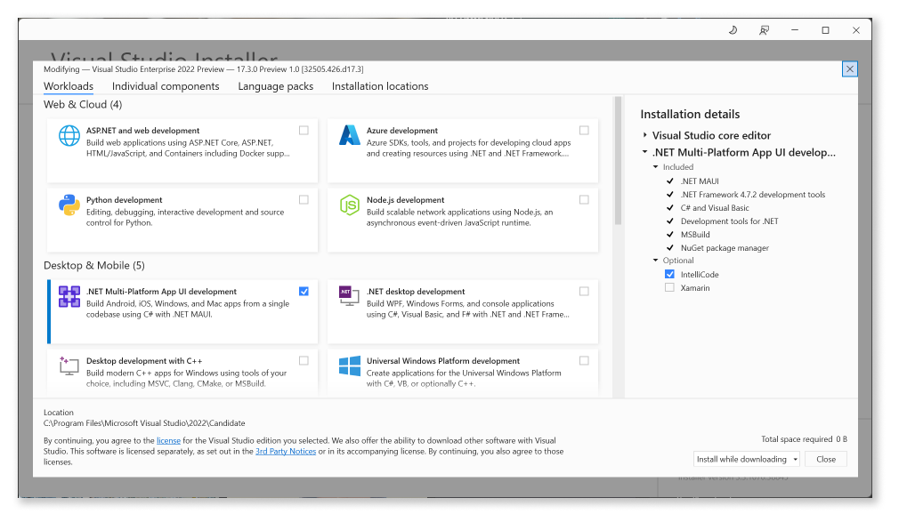 Windows 에서 .NET MAUI 사용을 시작하려면 Visual Studio 2022 Preview 를 설치하거나 version 17.3 Preview 1.1 로 update 하십시오. installer 에서 “.NET Multi-platform App UI development” workload 를 선택합니다.