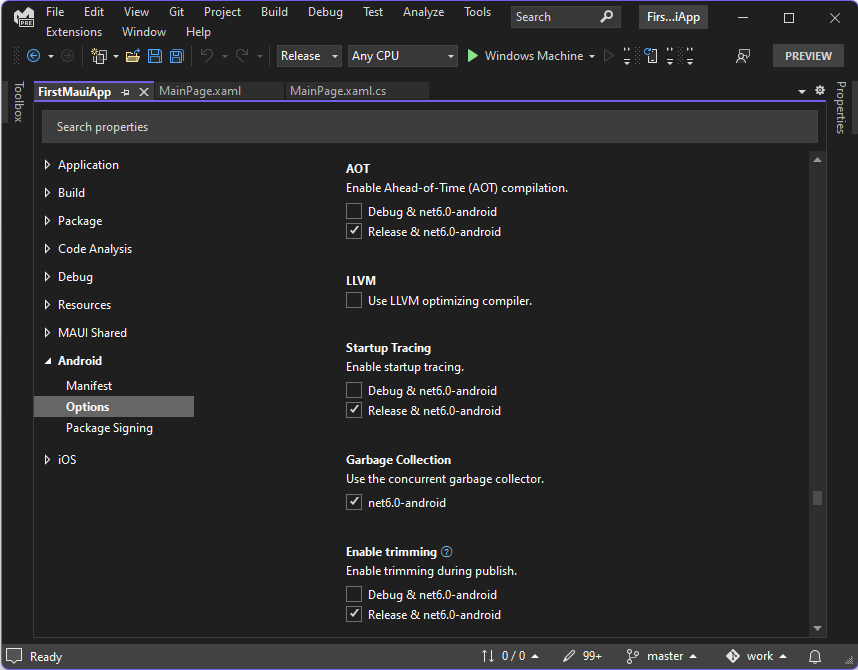 Visual Studio 2022 는 올해 후반에 GA .NET MAUI tooling support 를 지원할 것입니다. 현재 Windows 에서 여러분은 XAML, .NET Hot Reload 기능과 XAML, C#, Razor, CSS 들을 편집할 수 있는 강력한 editor 를 사용하여 여러분의 개발 작업(dev loop) 속도를 가속화 할 수 있습니다. XAML Live Preview 와 Visual Tree 를 사용하여 여러분은 debugging 하는 동안 UI 를 미리보고 정렬하고 검사할 수 있으며 편집할 수 있습니다. .NET MAUI 의 새로운 단일 project 경험은 multi-platform targeting 앱으로 구성할 수 있도록 시각적인 편집환경을 위해 project 속성 page 를 추가했습니다.