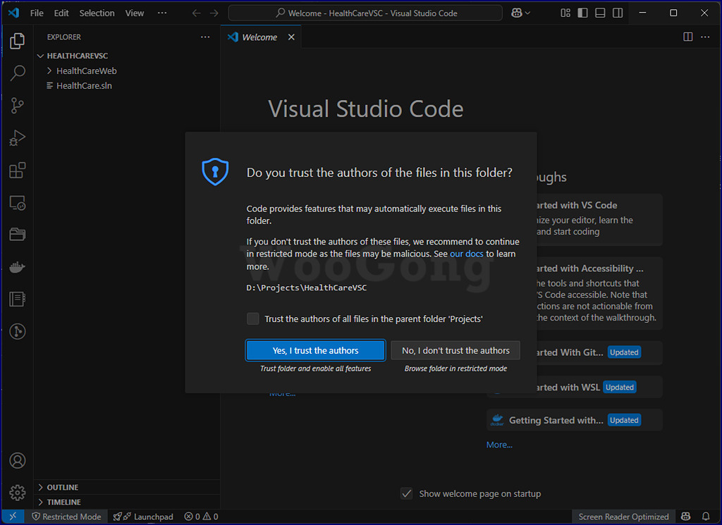 이젠 "File" 메뉴에서 "Open Folder..."를 선택해서 만든 폴더를 엽니다. Folder 를 믿을만 한 작성자가 만든 것인지 확인하는 화면이 나타납니다.