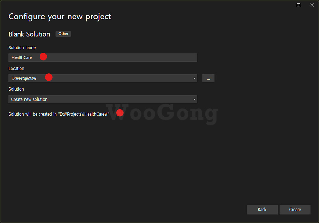 Location : 프로젝트 파일들을 저장할 폴더 경로를 HealthCare Solution 폴더 아래로 지정합니다.