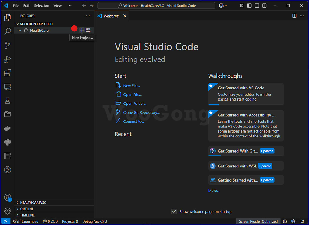 먼저 프로젝트 파일을 저장할 HealthCareVSC 폴더를 하나 만들어 진행하겠습니다. VS Code 를 실행하고 "Ctrl + `" 눌러 "Terminal" 창을 엽니다. ("Terminal" 메뉴에서 "New Terminal"을 클릭해서 터미널 창을 열어 진행할 수도 있습니다)