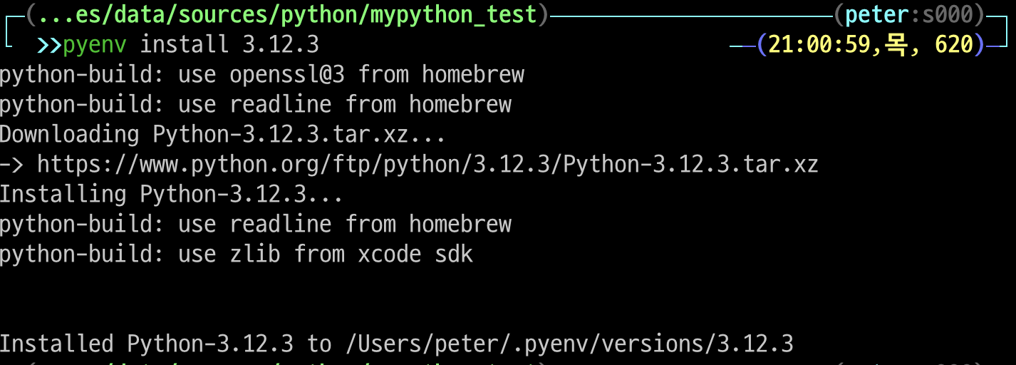 pyenv를 사용하여 원하는 Python 버전을 설치합니다. 예를 들어 Python 3.12.3을 설치하려면 다음 명령어를 실행합니다: