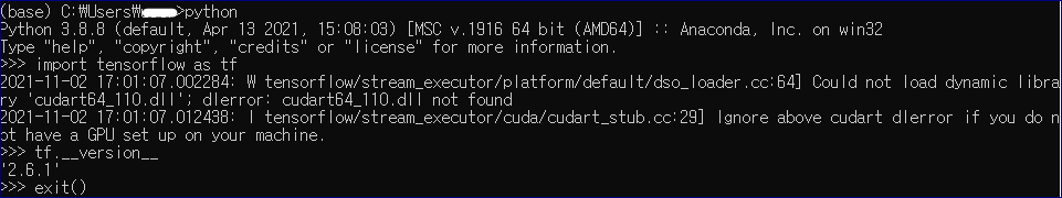 설치 후 prompt 에서 tensorflow version 을 확인한다.