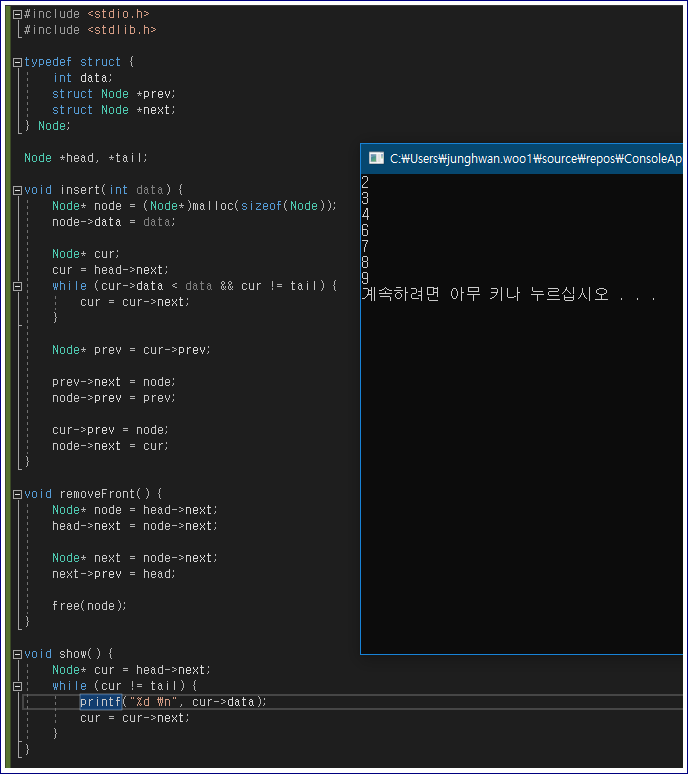 while (cur->data < data && cur != tail) {