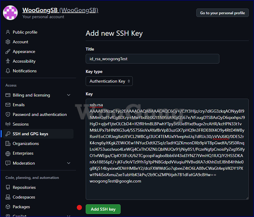 - Key 필드에 .pub 파일의 내용을 복사하여 붙여넣습니다. .pub 파일은 텍스트 편집기(메모장, VS Code 등)로 열 수 있습니다. (예: ~/.ssh/id_rsa_woogongTest.pub 파일 내용)