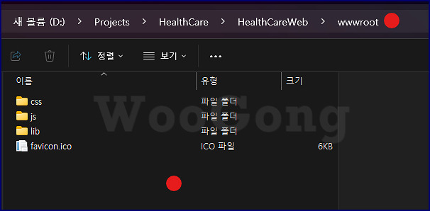 그리고 Visual Studio 2022 의 Solution Explorer (솔루션 탐색기)에서 wwwroot를 오른쪽 click 하여 "Open Folder in File Explorer(파일탐색기에서 폴더열기)" 를 cliek 합니다.