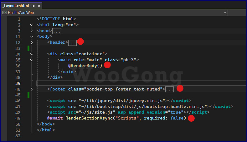 "Medcare" template을 이용한 MVC Web Application 구축, 다섯 번째 입니다. 지난 4편에서는 각 메뉴의 기본적인 뼈대인 Controller와 해당 controller 의 index ActionMethod 에 대응하는index.cshtml View 파일을 만드는 과정을 살펴봤습니다. 이제 웹사이트의 기본적인 구조를 갖추었으니, 이번 편에서는 모든 페이지에 공통으로 적용될 Layout 을 template 에서 어떻게 가져와서 _Layout.cshtml 파일을 구성하는지 살펴보겠습니다.