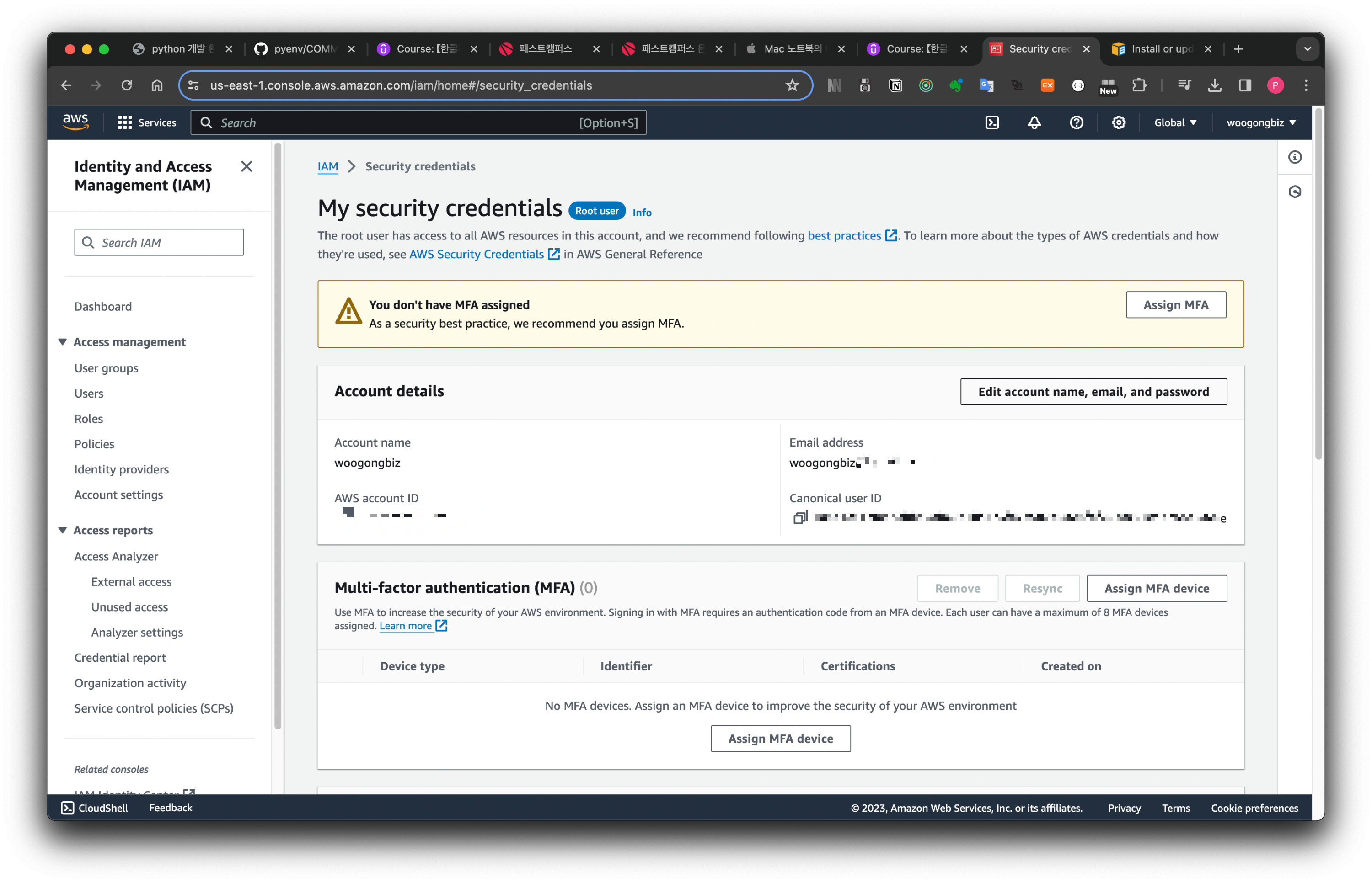 로그인 한 자신의 security credentials 정보를 보여줍니다.