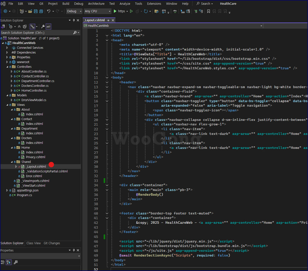 "Medcare" template을 이용한 MVC Web Application 구축, 다섯 번째 입니다. 지난 4편에서는 각 메뉴의 기본적인 뼈대인 Controller와 해당 controller 의 index ActionMethod 에 대응하는index.cshtml View 파일을 만드는 과정을 살펴봤습니다. 이제 웹사이트의 기본적인 구조를 갖추었으니, 이번 편에서는 모든 페이지에 공통으로 적용될 Layout 을 template 에서 어떻게 가져와서 _Layout.cshtml 파일을 구성하는지 살펴보겠습니다.