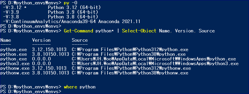 현재 Windows 에 설치된 Python 의 version 들을 확인합니다.