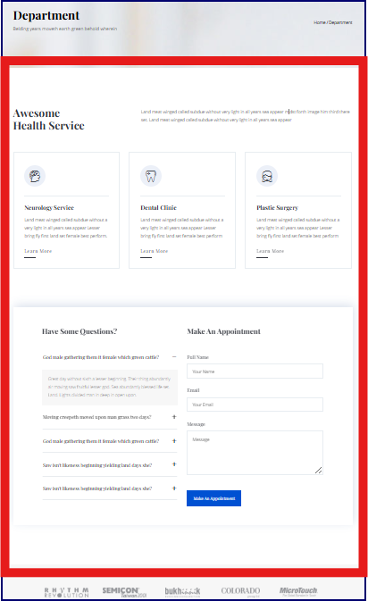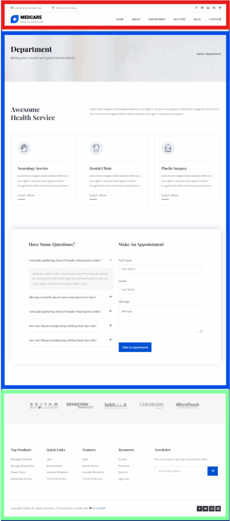 Body 영역은 각 Menu Page의 실제 내용을 담는 곳입니다. 예를 들어, "About" Page에서는 기관의 소개, 역사, 비전 등의 정보가 표시될 것이고, "Doctors" Page에서는 의료진의 정보와 전문 분야 등이 소개될 것입니다. Themewagon Template은 각 Page의 목적에 맞게 깔끔하고 정돈된 Layout을 제공합니다.