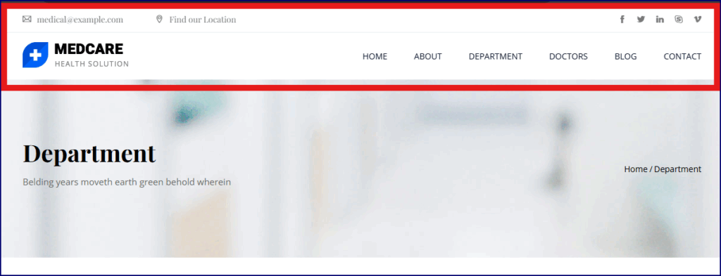 Header 영역은 Website의 얼굴이라고 할 수 있습니다. Medcare Template의 Header는 다음과 같은 요소들로 구성되어 있습니다.