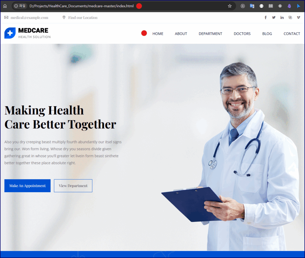 압축을 풀고 폴더를 살펴보면, 우리 눈에 익숙한 css, fonts, img, js, scss 폴더와 함께 index.html, about.html, department.html, doctors.html, blog.html, contact.html과 같은 메뉴별 HTML 파일들을 확인할 수 있습니다. 특히, CSS를 동적으로 관리할 수 있도록 scss 폴더가 제공되는 점과,Template적용에 유용한 document 파일이 포함된 점이 좋네요.