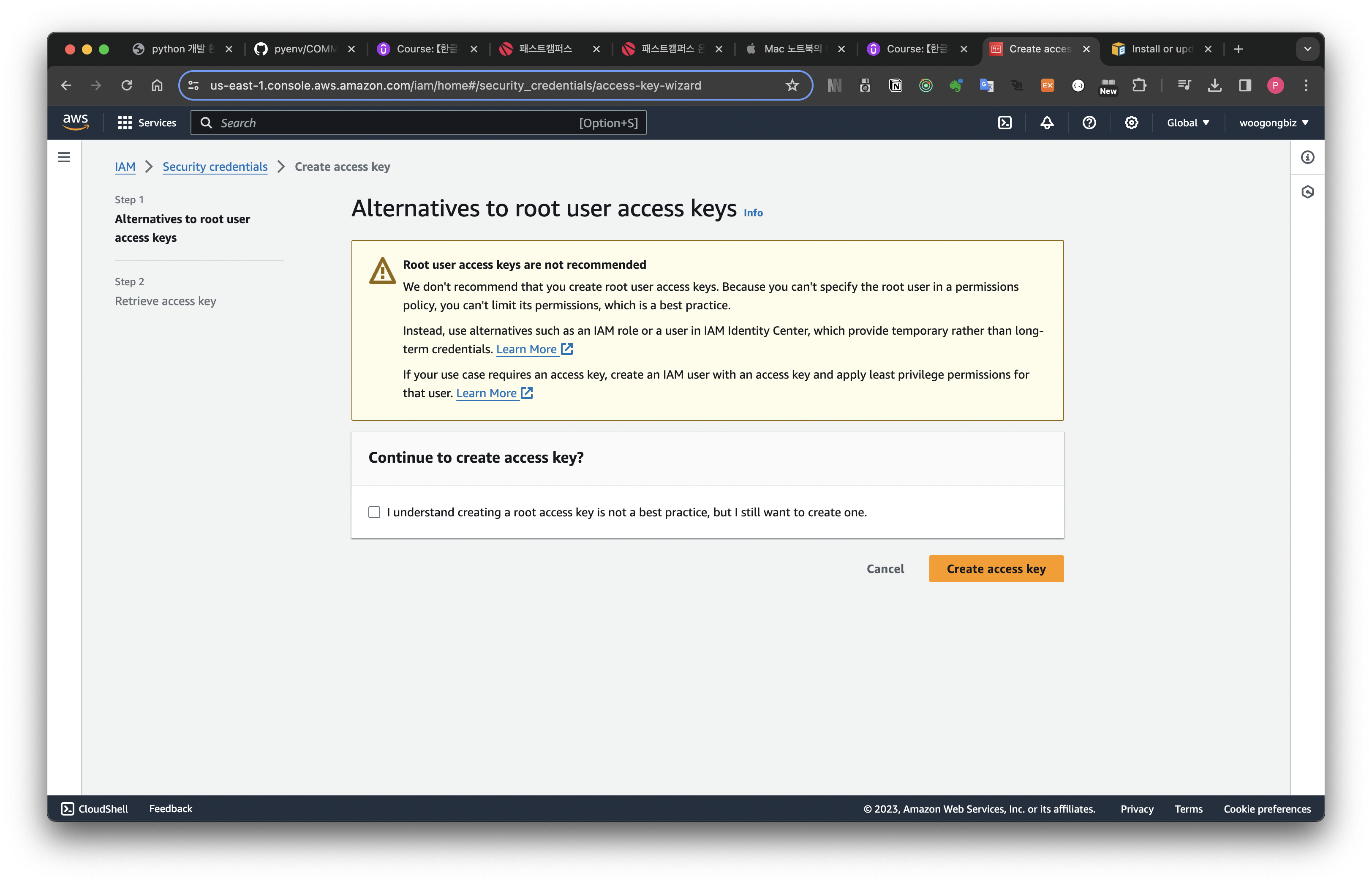 오렌지색 "Create access key" button 을 click 합니다.