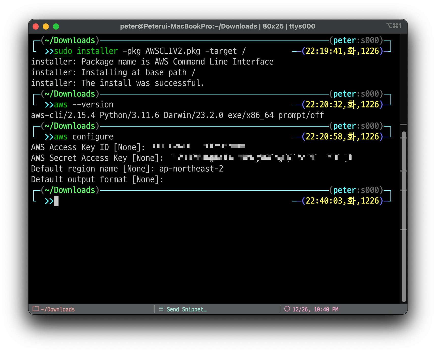 이제 Terminal 에서 AWS 에 접속하기 위한 방법은 다음과 같습니다.