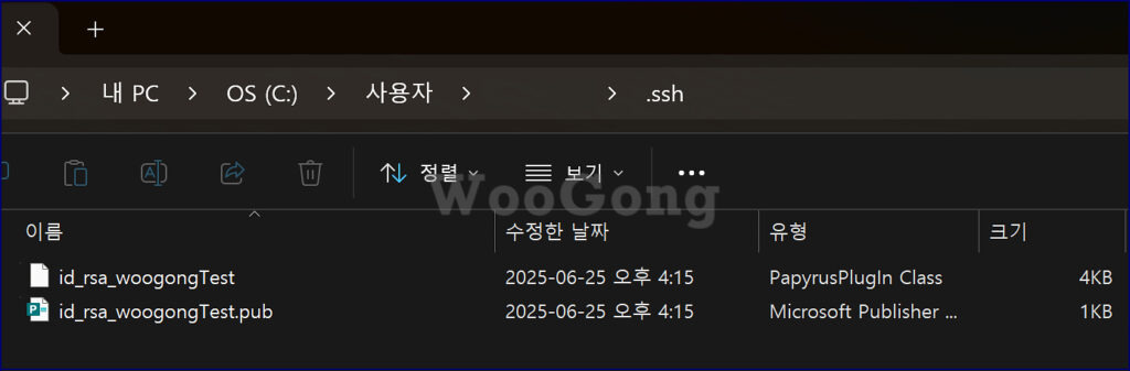 - Key 필드에 .pub 파일의 내용을 복사하여 붙여넣습니다. .pub 파일은 텍스트 편집기(메모장, VS Code 등)로 열 수 있습니다. (예: ~/.ssh/id_rsa_woogongTest.pub 파일 내용)