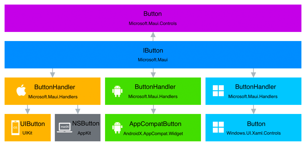 둘 사이에 유사점이 있지만 .NET MAUI 구현이 훨씬 더 간결합니다. .NET MAUI 내부의 일부 변경으로 인해 custom renderer 를 사용할 때 함께 따라오던 많은 기술적인 사항들도정리되었습니다. handler infrastructure 의 architecture 를 Figure 3 에 요약했습니다. 이 sample 은 button 이 device 화면에 rendering 되기 위해 통과하는 layer 들을 보여줍니다.