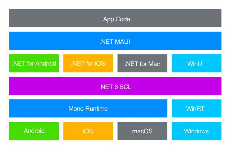 .NET MAUI 는 현재 Xamarin.Forms 로 부터 진화했습니다. IOS, Android 와 같은 다양한 형태의 Workload 들이 이제 .NET 의 일부인 Single .NET 6 Base Class Library (BCL) 에 존재합니다. 그래서 여러분의 코드에서 사용되는 기본 platform 의 세부정보를 효과적으로 추상화합니다. 여러분의 App 이 IOS, Android, MacOS 에서 실행된다면 일관된 API 와 동작을 제공하기위해서 Common BCL 에 의존하며, Window 상에서 작동하는 App 이라면 이를 처리하는 .NET Runtime 은 CoreCLR 입니다.